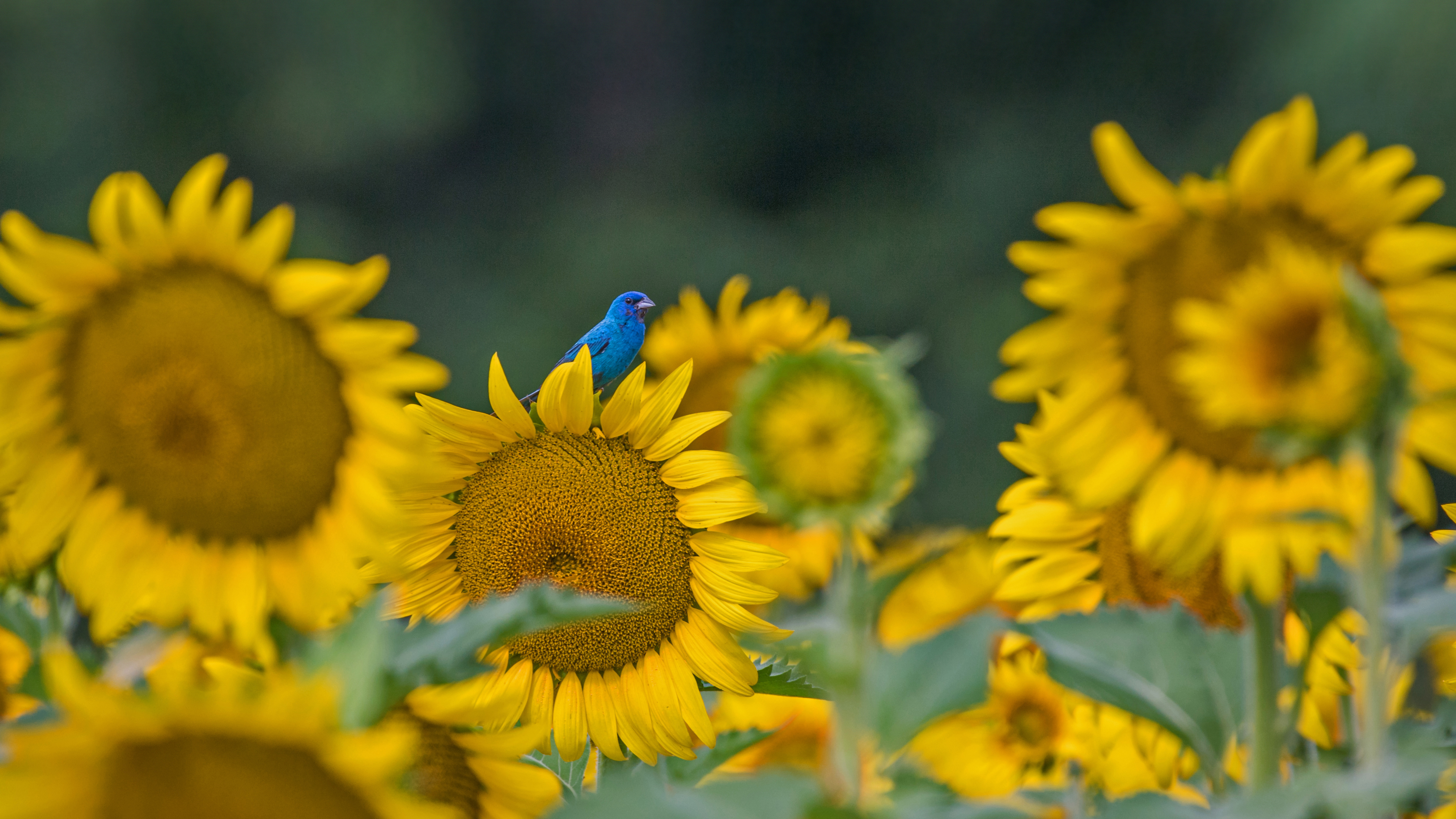 An indigo bunting on a sunflower (© William Krumpelman/盖蒂图片社)