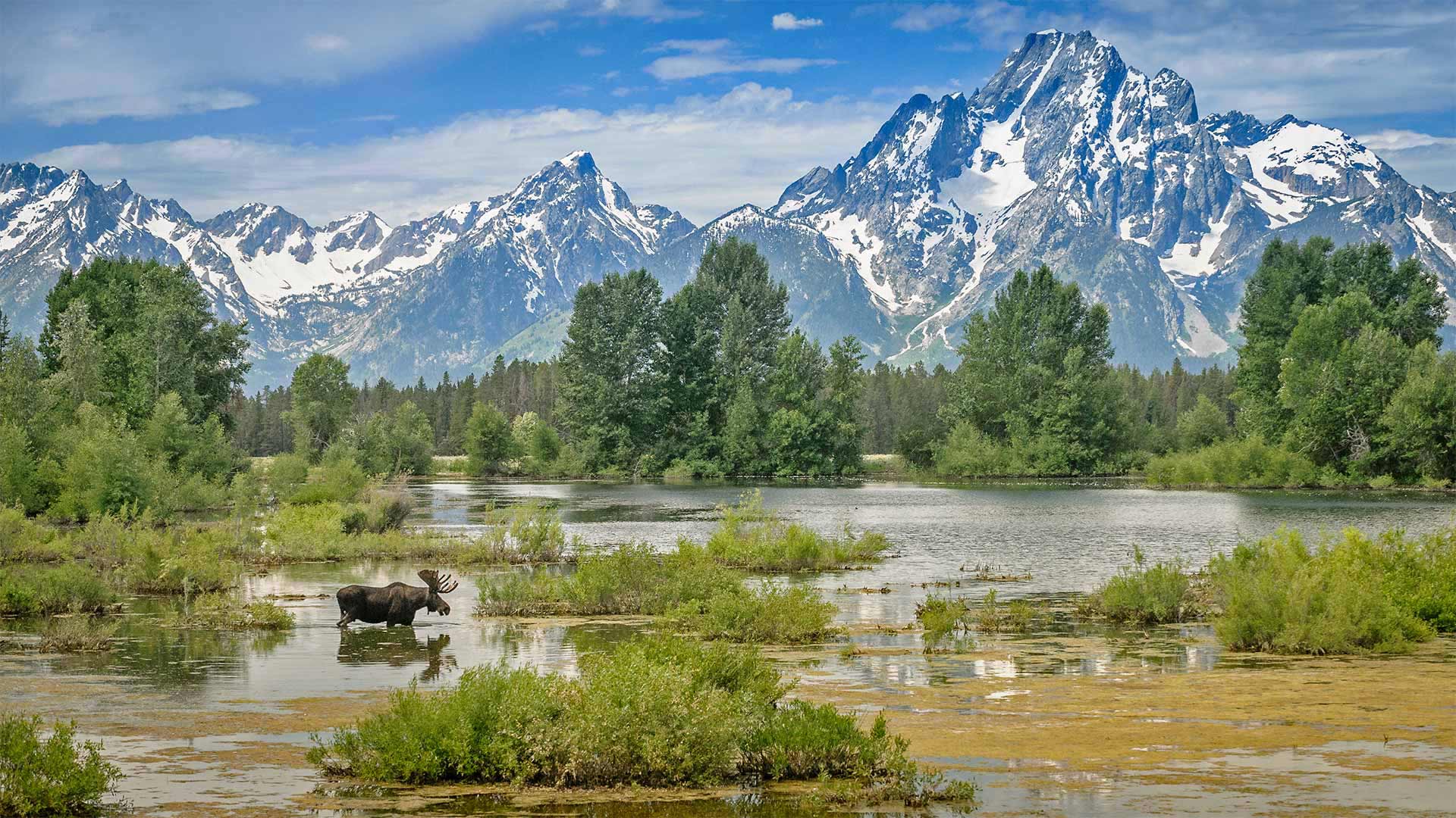 Moose crossing a pond below Mount Moran, Grand Teton National Park, 怀俄明州 (© Jim Stamates/Minden Pictures)
