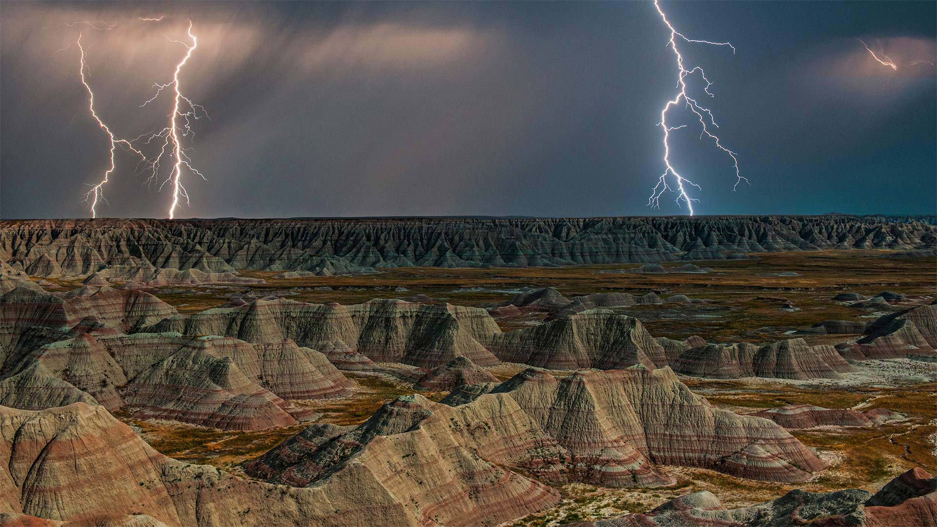 Rock formations in Badlands National Park during a lightning storm, 南达科他州 (© DEEPOL by plainpicture)