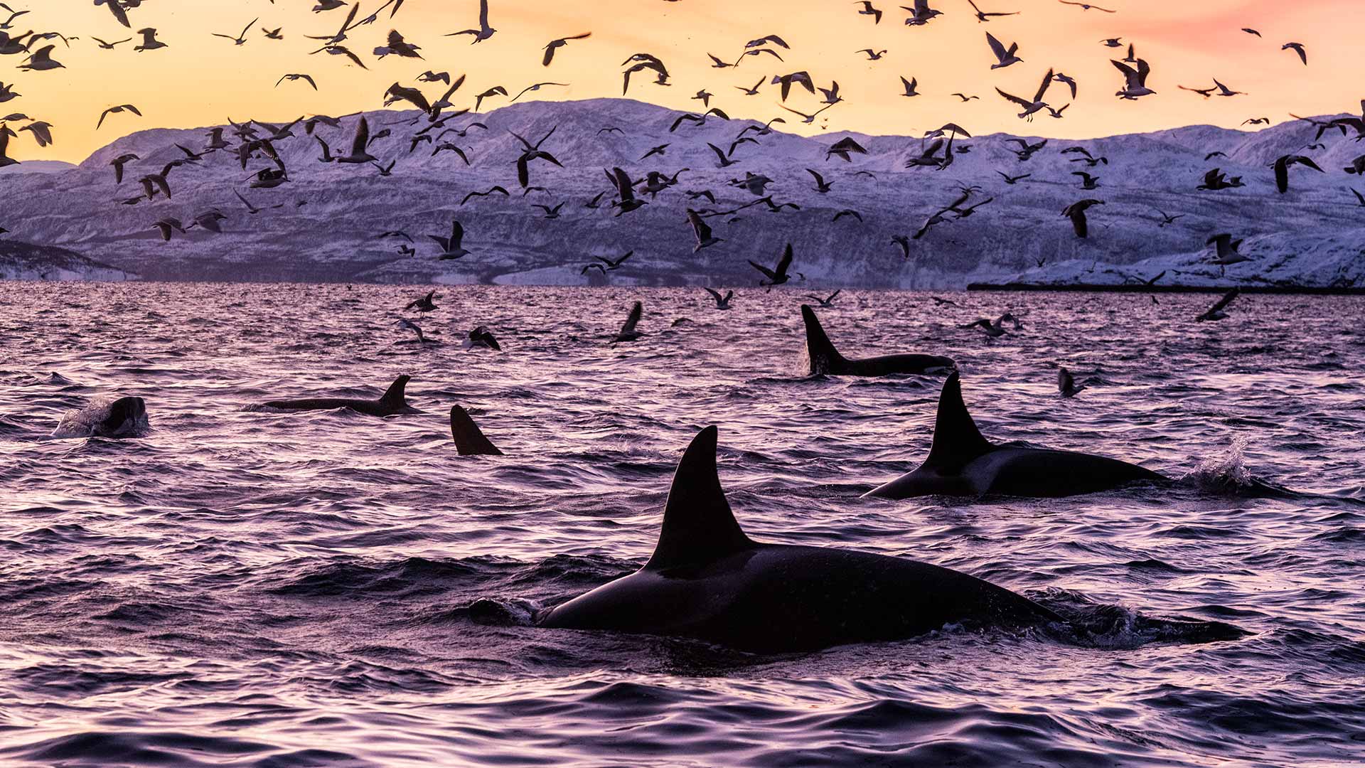 Killer whales in the waters off Spildra, 挪威 (© Alex Mustard/Minden Pictures)